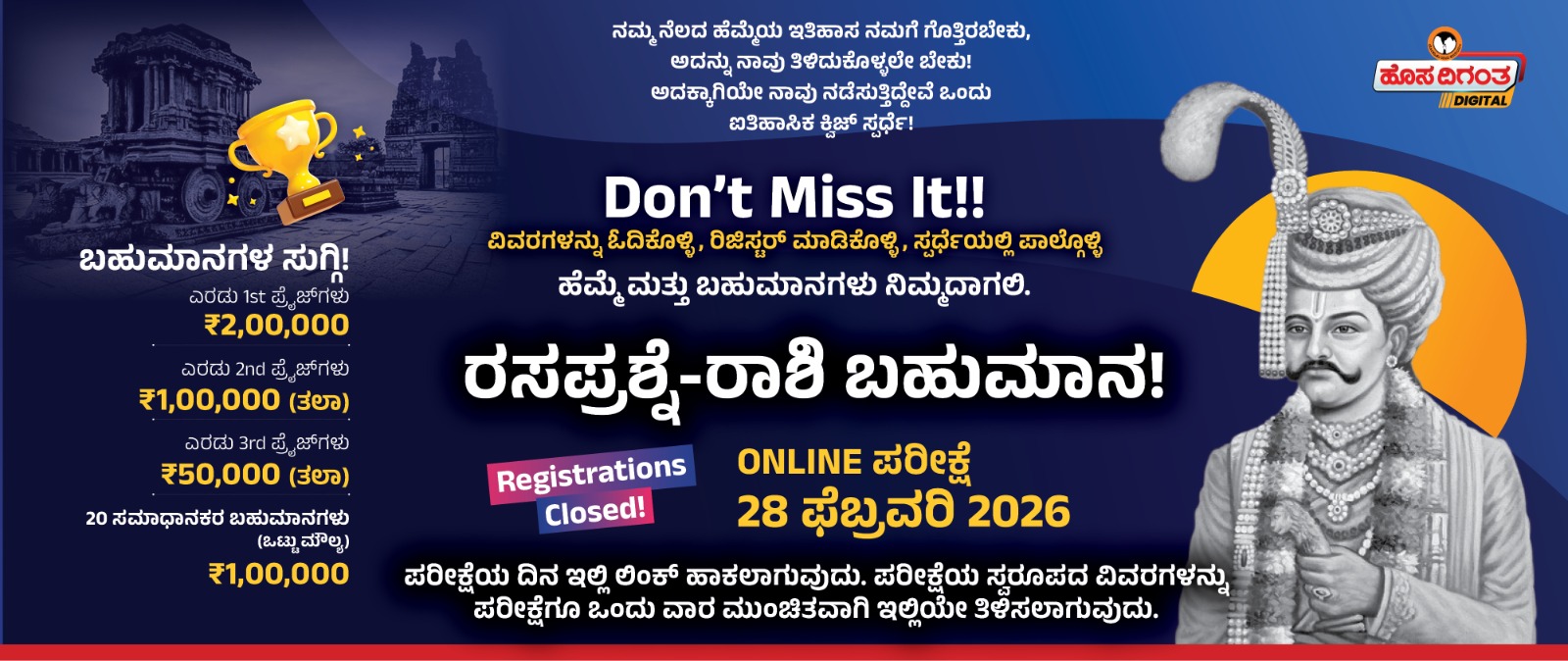 ನಿಮಗೆಷ್ಟು ಗೊತ್ತಿದೆ, ಜಗತ್ತನ್ನೇ ಬೆರಗುಗೊಳಿಸಿದ್ದ ಹಿಂದೂ ಸಾಮ್ರಾಜ್ಯದ ಕಥೆ? ನಮ್ಮ ಹೊಸದಿಗಂತ ಡಿಜಿಟಲ್ ಚಾನಲ್ಲಿನಲ್ಲಿ ಖ್ಯಾತ ಇತಿಹಾಸ ತಜ್ಞರು ನಡೆಸಿಕೊಡುವ ‘ವಿಜಯನಗರ ವೈಭವ’ ಕಾರ್ಯಕ್ರಮ ಸರಣಿಯನ್ನು ನೋಡಿ, ನಿಮ್ಮ ಜ್ಞಾನವನ್ನು ನಮ್ಮ ಸ್ಪರ್ಧೆಯಲ್ಲಿ ಒರೆಗೆ ಹಚ್ಚಿಕೊಳ್ಳಿ, ಲಕ್ಷಾಂತರ ರುಪಾಯಿಯ ಬಹುಮಾನಗಳನ್ನು ಗೆಲ್ಲಿ!